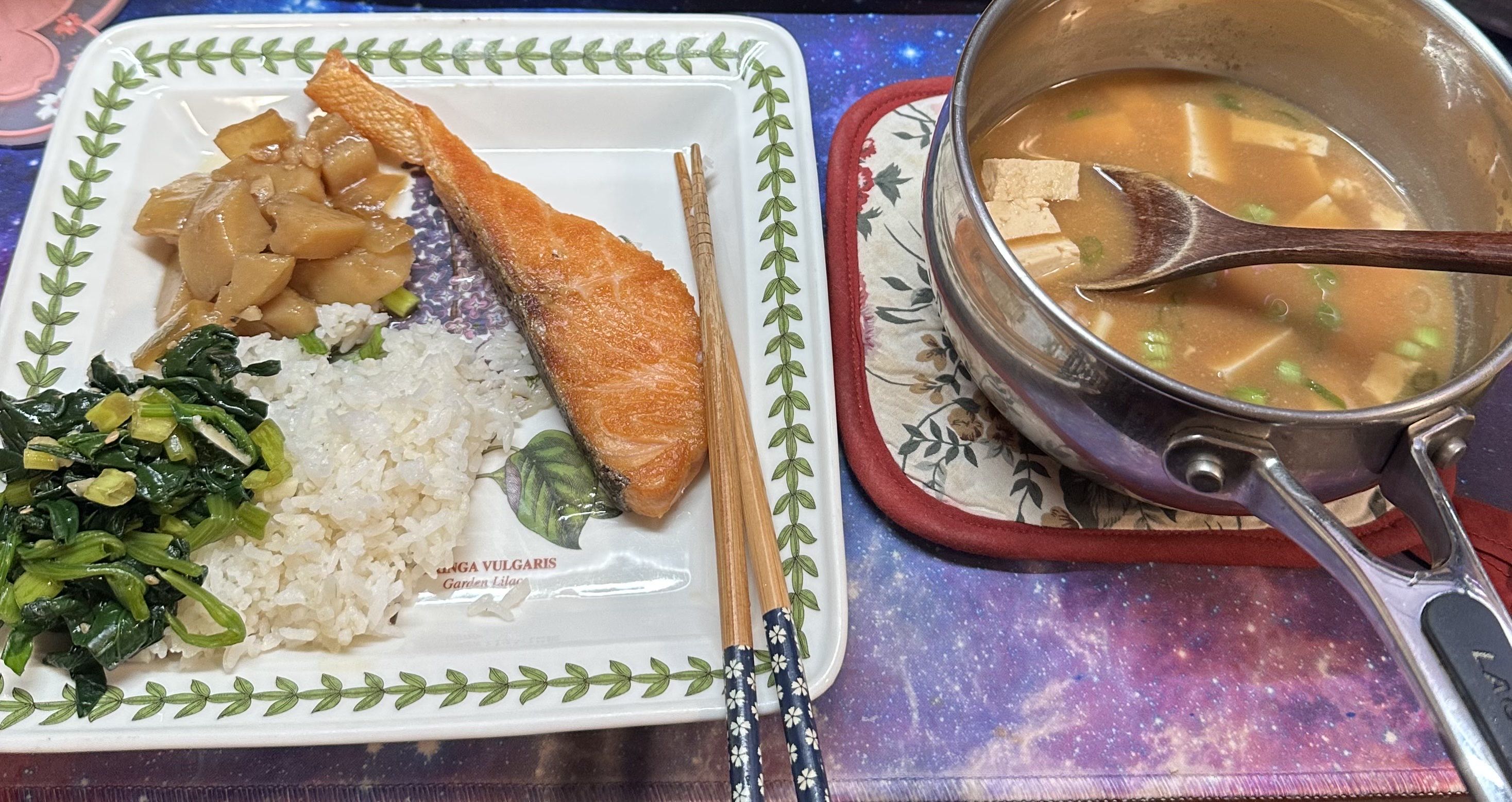 Jan 2026: One of my favourite meal preps is shiozake, or salted salmon. It's SO easy, you just heavily salt some salmon pieces with the skin on, wrap in paper towels, and let it sit in the fridge overnight. And then you pan fry them on medium heat for ~3 mins per side and serve with rice. But today, I kicked it up a notch and ate it with miso soup, gamja jorim, and sigeumchi namul. It was a flavour bomb fr. Highly recommend.